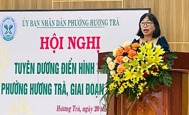 Đồng chí Doãn Thị Sen phát biểu tham luận tại Hội nghị tuyên dương điển hình tiêu biểu phường Hương Trà 5 năm giai đoạn 2020 - 2025