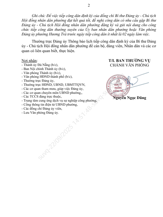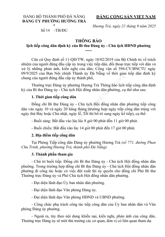 Lịch tiếp công dân định kỳ của Bí thư Đảng ủy - Chủ tịch HĐND phường