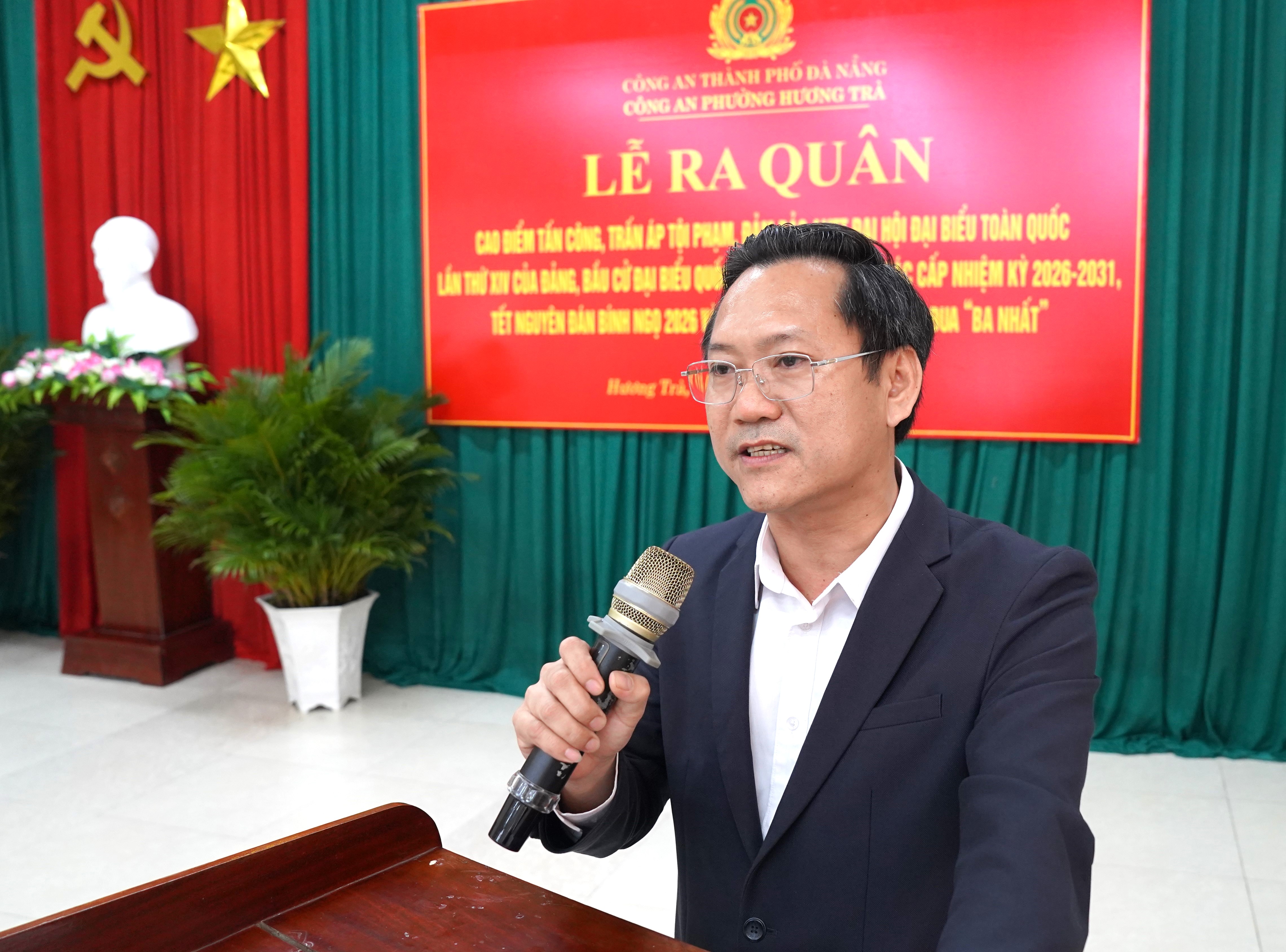 Phát biểu chỉ đạo tại Lễ ra quân, đồng chí Trần Trung Hậu, Phó Bí thư Đảng ủy, Chủ tịch UBND phường khẳng định: “Đợt ra quân cao điểm thể hiện quyết tâm chính trị của Đảng ủy, chính quyền và lực lượng Công an phường Hương Trà trong công tác đảm bảo an ninh trật tự, Đại hội đại biểu toàn quốc lần thứ XIV của Đảng, bầu cử đại biểu Quốc hội khóa XVI, HĐND các cấp nhiệm kỳ 2026 – 2031, Tết Nguyên đán. Việc tổ chức ra quân không chỉ nhằm bảo vệ tuyệt đối an toàn các sự kiện chính trị trọng đại mà còn thể hiện rõ bản lĩnh chính trị, tinh thần trách nhiệm và vai trò làm chủ địa bàn của lực lượng Công an trong mọi điều kiện”. Đồng chí chủ tịch UBND phường yêu cầu lực lượng Công an phường gắn nhiệm vụ của Đợt cao điểm với phong trào thi đua “Ba nhất”, nâng cao tinh thần trách nhiệm của mỗi CBCS Công an lấy đó làm thướt đo đánh giá chất lượng, hiệu quả công tác.